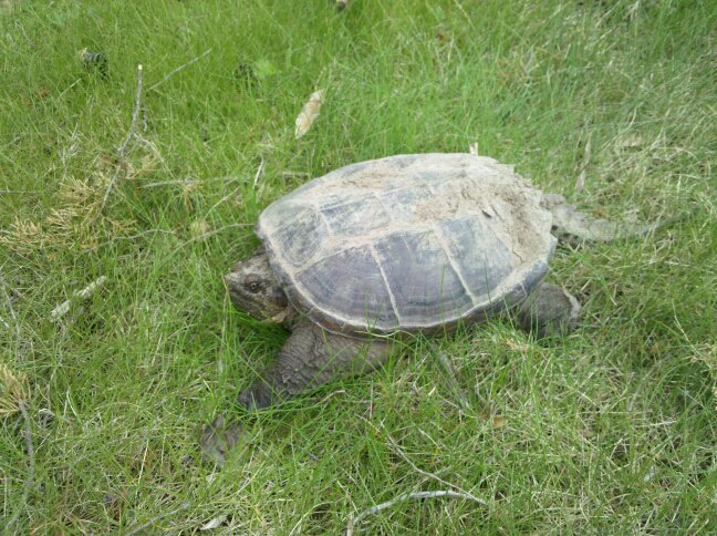 What I gathered is that there was something off to our right in the strip of grass between the road and the tree buffer along the river bank. I hopped out of the boat and inched closer to get a look. It took me a minute or two and lots of looking back and forth for a visual game of Hot or Cold to try to find what he was seeing: a HUGE turtle staring right at me!
